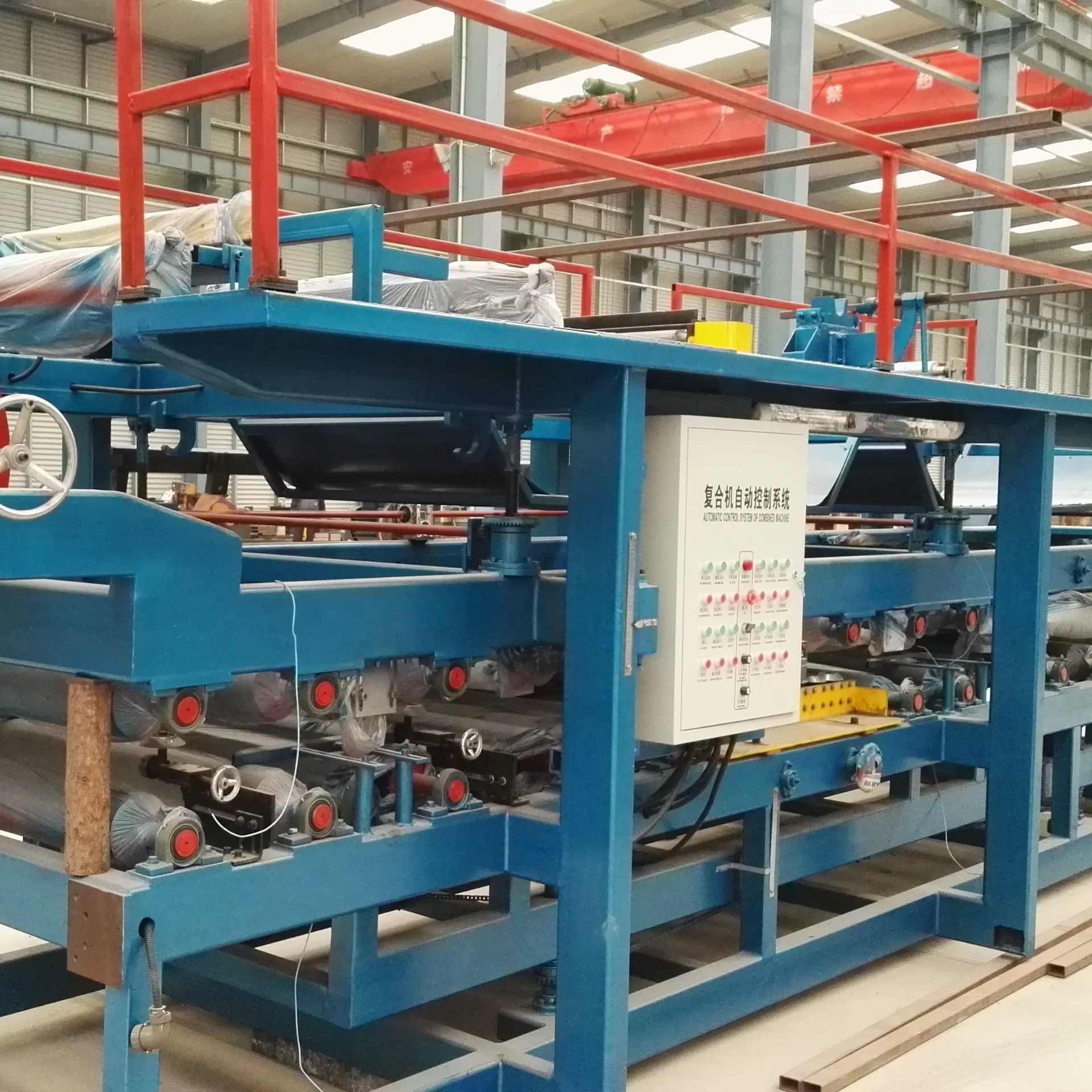 Driftshastigheden af sandwichpanelproduktionslinjen er trinløs computerstyret for at realisere den stabile driftshastighed og enkle betjening af produktionslinjen.