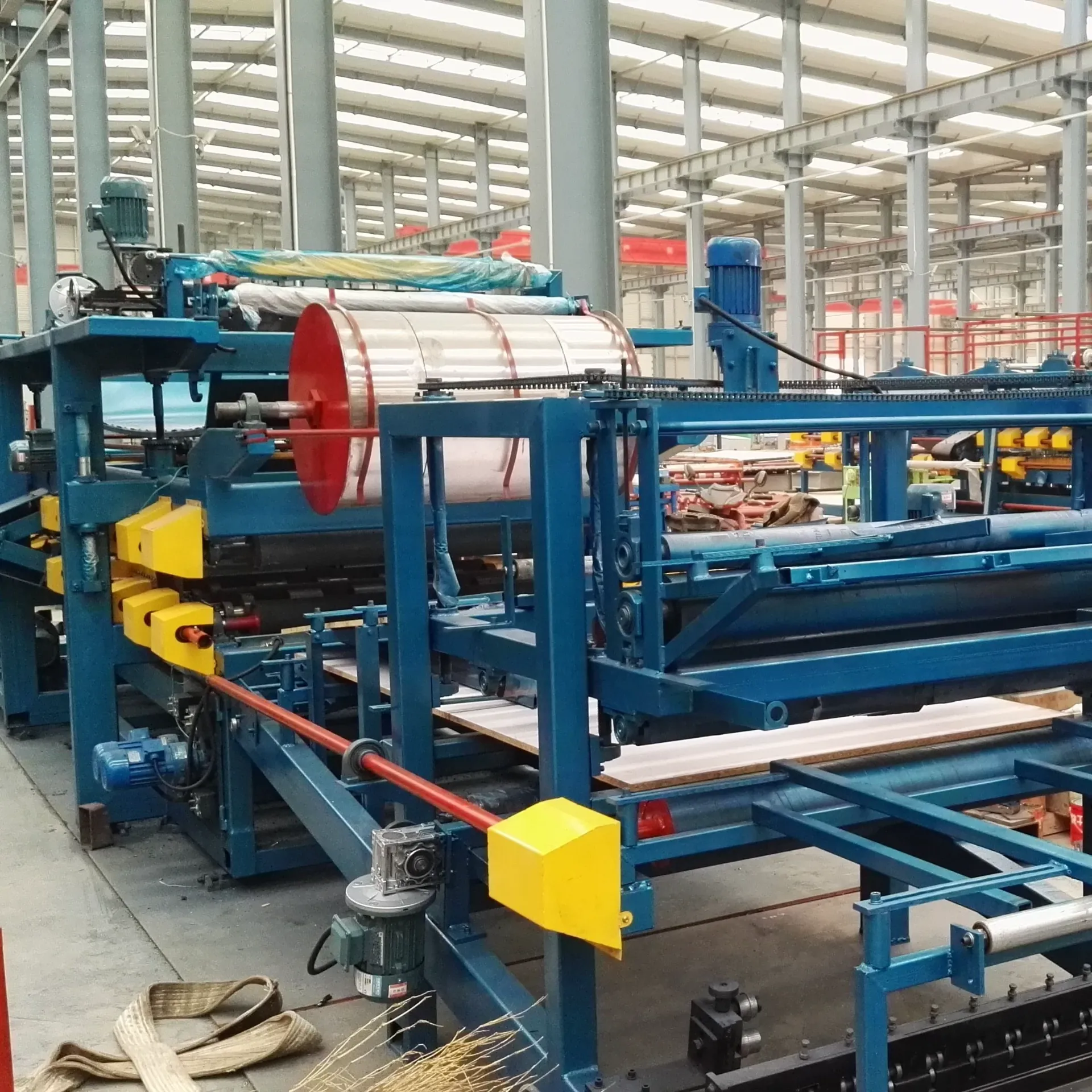 Roof and wall sandwich panel production line adopts advanced technology integrating pneumatic, electric and mechanical technologies. It is the special machine for the production of heat insulated color-steel sandwich plates.